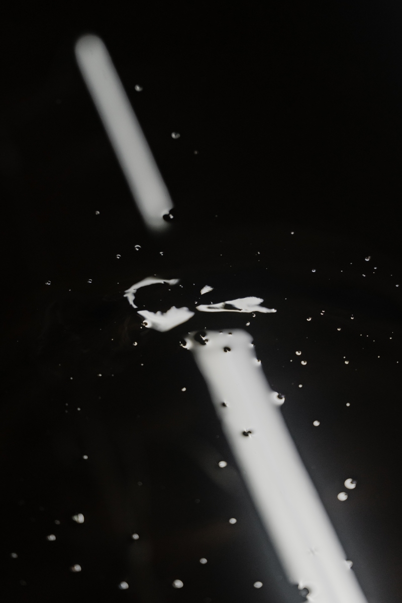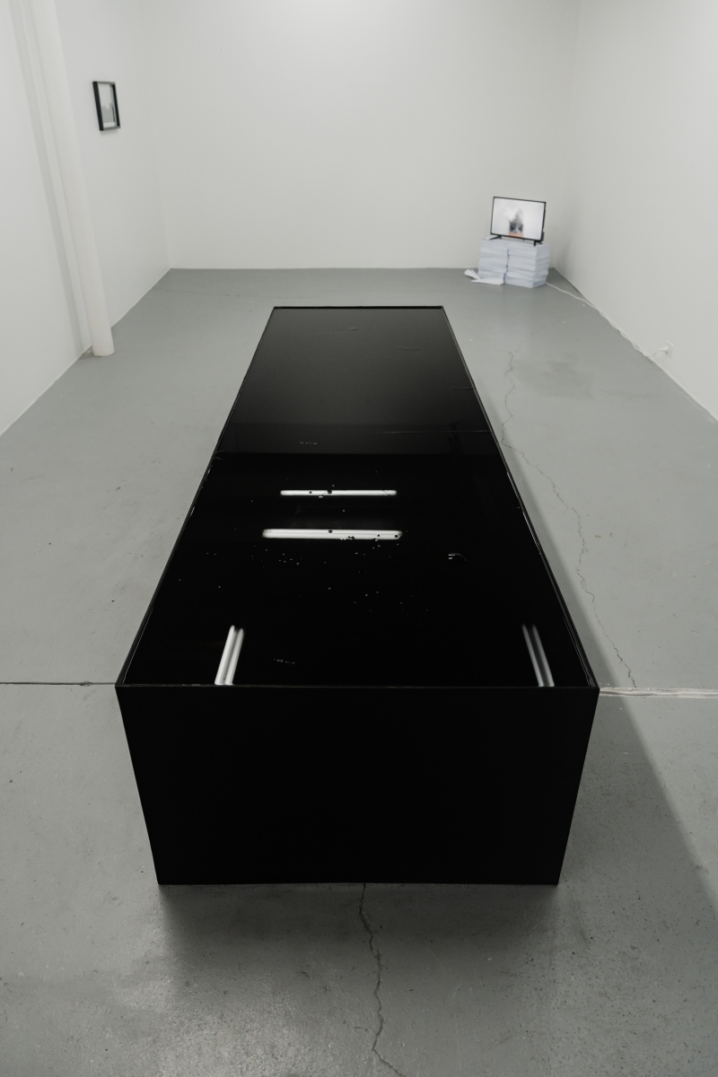 Alannah Dair, installation view of Black Bile II, 2025, Engine oil, iron oxide, neodymium magnets, motors, proximity sensor, arduino uno, aluminium and wood. 90 x 60 x 300cm. Black Bile II was shown alongside photographs by Zarni Kuniead Tun, poem and video work by Meadowbrook Ow. Image credits: Terence-Kent Ow.